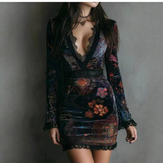 V neck Lace Printed Long Sleeved Dress