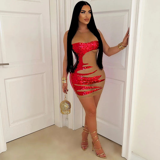 Style: Sexy Fit: Slim Fabric: Polyester Pattern: Non Element: Sequin,Lace/Tulle/Fishnet,Patchwork Neckline: Crew Neck Sleeve Type:...