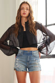 This see-through crop shirt is a daring and stylish piece that adds a touch of edginess to your outfit. The sheer fabric creates a transparent effect, allowing for a glimpse of the skin underneath. Perfect for creating a bold and modern look, this crop shirt can be layered over a bralette or tank top for a fashion-forward ensemble.