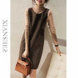 Add a touch of timeless charm to your wardrobe with this houndstooth-patterned woolen vest dress. Designed with a round neckline and sleeveless cut, it’s perfect for effortless layering over turtlenecks, blouses, or shirts. The A-line silhouette flatters the figure while offering comfortable movement, making it ideal for both casual outings and office wear.