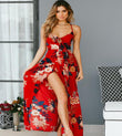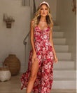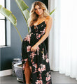 Printed Swing Slit Slim-Fitting Strappy Low Cut Maxi Dress