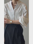 Elevate your everyday wardrobe with our Stand Collar Pleated Puff Sleeve Button-Up Shirt – where timeless simplicity meets effortless style.