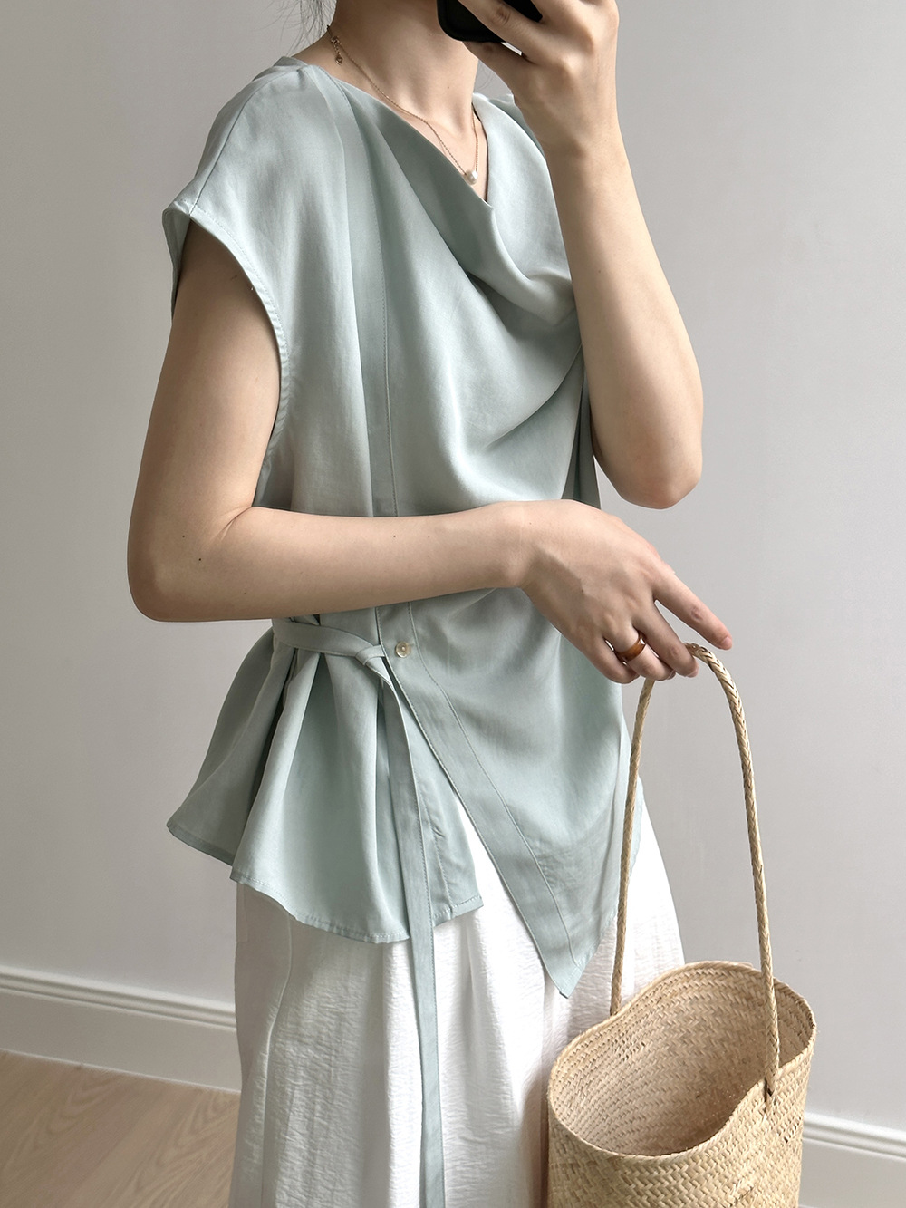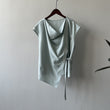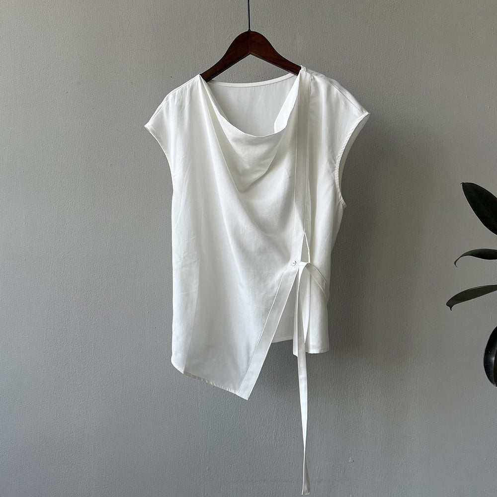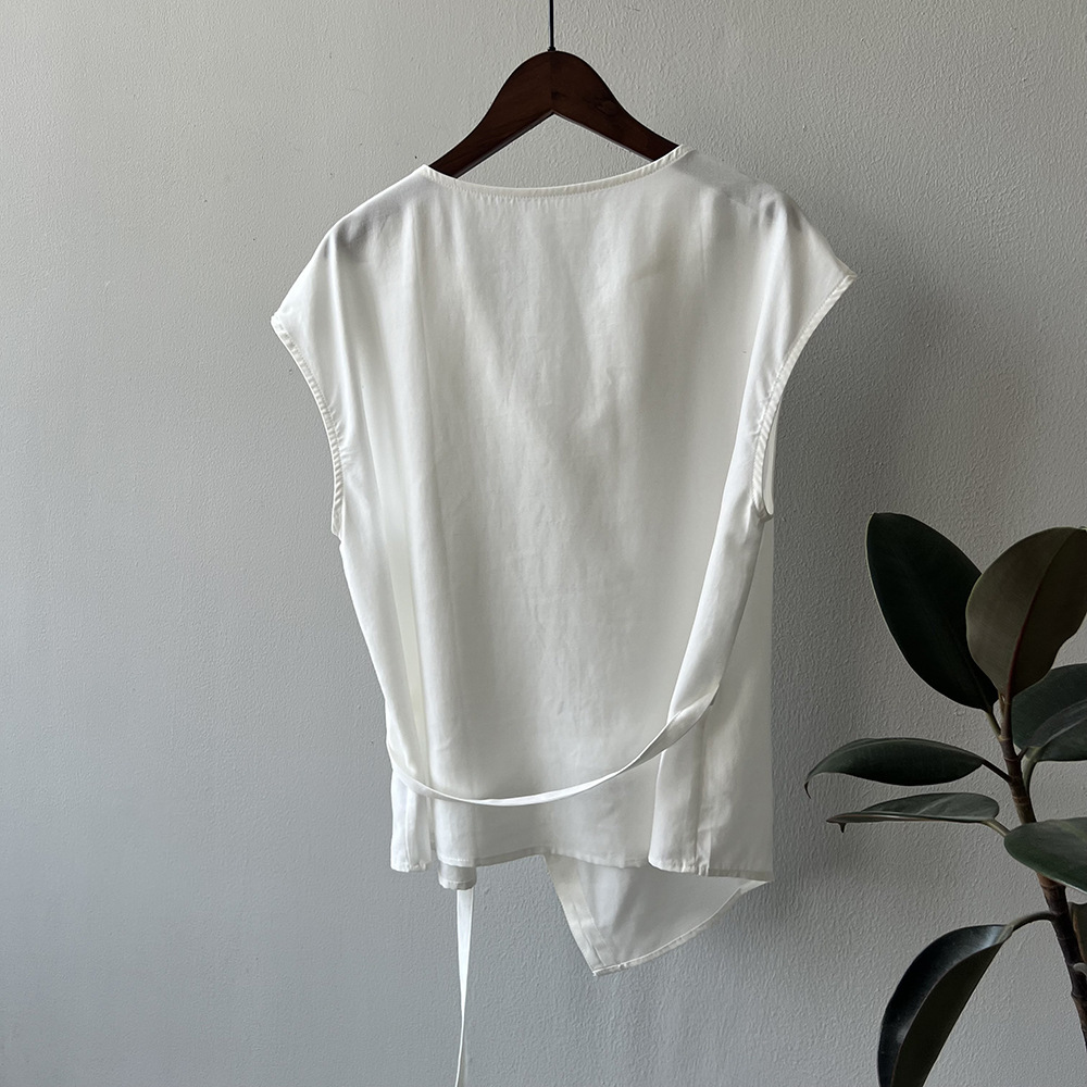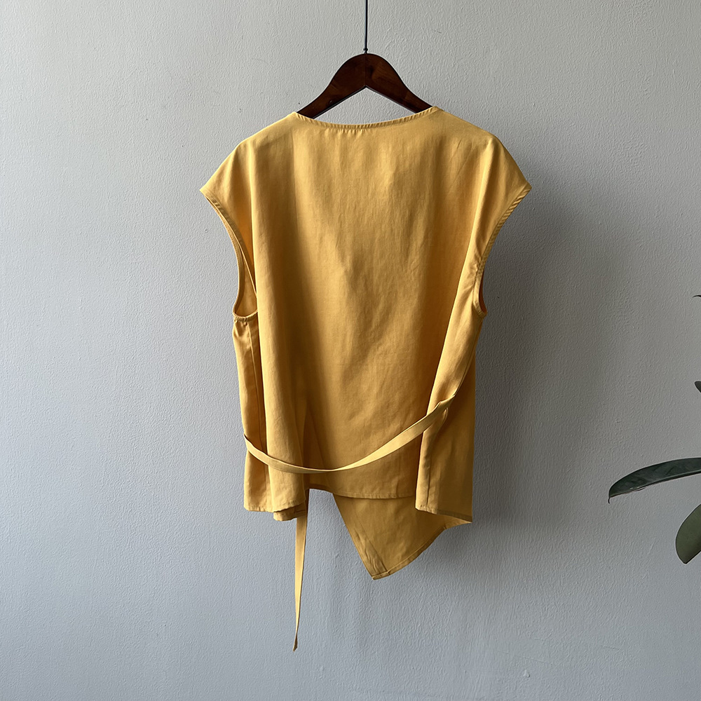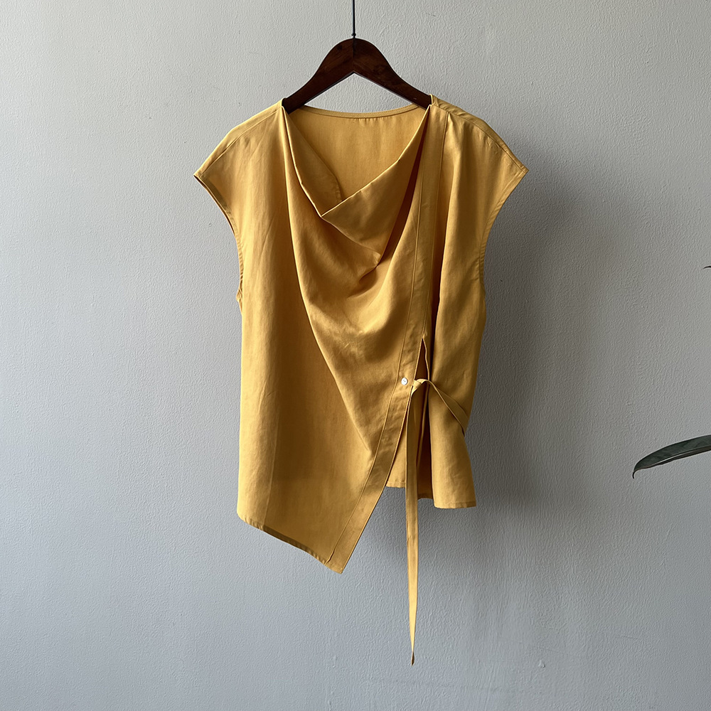 Swing Collar Tencel Shirt Women Summer Waist Controlled Self Tie Slit Sleeveless Shirt